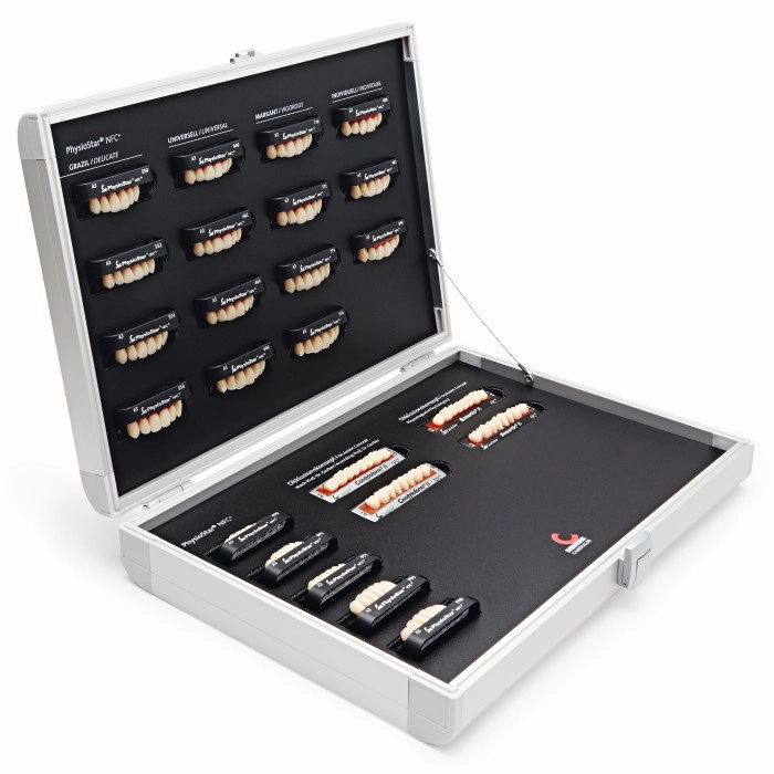 The aluminum »working tooth mold guide« is composed of 15 maxillary and 5 mandibular sets as well as the two occlusion concepts Condyloform® II NFC+ and Bonartic® II NFC+. The guide serves to help select molds for the individual assessment and design of dentures in daily routine.