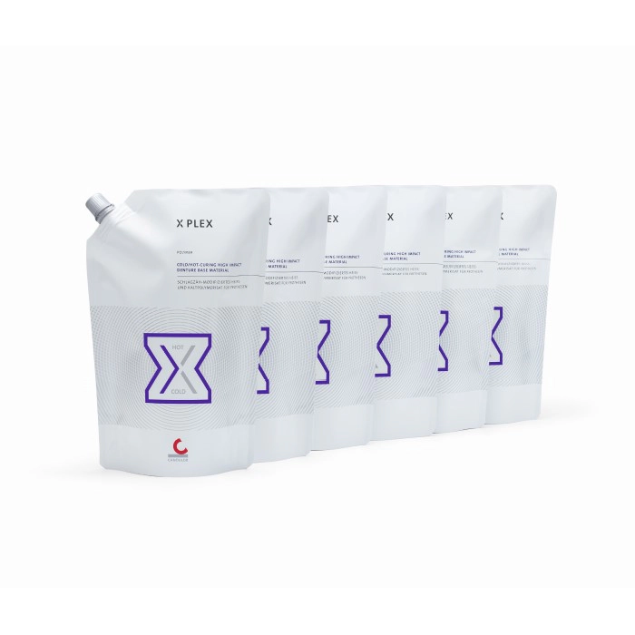 XPLEX – the high-impact polymer for dual use. Developed to cover the different processes and needs in the laboratory. The polymer is suitable for cold and hot polymerization. Whether packing, pressing or pouring: the choice of HOT or COLD processing is governed by the respective HOT or COLD monomer component.